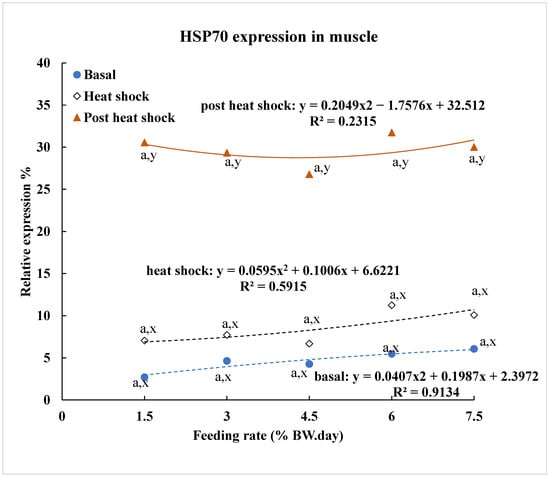 Unlike in liver tissue, no significant difference in the basal level of HSP70 expression was observed across various feeding rates in muscle tissue, whether under basal, heat shock, or post-heat shock conditions (Figure 4). However, a significant correlation was found between basal or heat shock levels of HSP70 expression and different feeding rates.
