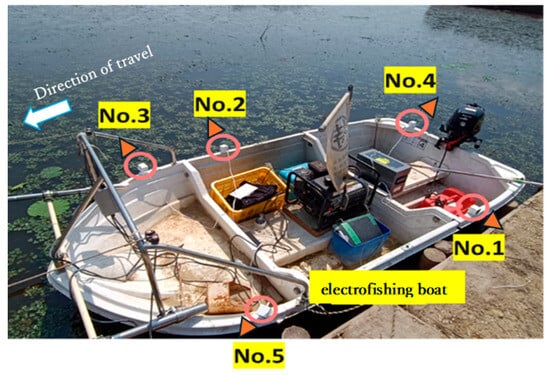 Lake Izunuma-Uchinuma is an important freshwater fish habitat in Japan and exhibits a fish fauna that reflects the formation history of eastern Japan []. Moreover, it is the primary habitat for small-scale bitterling (Acheilognathus typus (Bleeker, 1863)), a rare native species of eastern Japan []. Consequently, vigorous conservation activities for preserving the native fish assemblage, including extensive field surveys and invasive largemouth bass (Micropterus nigricans (Cuvier, 1828)) removal efforts, have been conducted [,]. Due to its high capture efficiency, an electrofishing boat has been employed for the removal of largemouth bass [,]. The electrofishing boat, which is 3.3 m in length, is equipped with a generator and transformer (2.5GPP; Smith Route). It delivers approximately 300 V of electricity while in motion, stunning fish within a diameter of about 4 m, causing them to float to the surface.