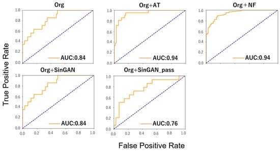 Table 4 presents the best evaluation metrics (champion data) extracted from the data obtained under different conditions for each method. The AUROC for Org was 0.836, while Org+AT increased to 0.942, and Org+NF achieved 0.940, indicating improved performance. However, Org+SinGAN showed the same AUROC as Org, and Org+SinGAN_pass resulted in a lower AUROC of 0.763. The model with the most notable improvement in AUROC was Org+AT, with an increase of 0.106.