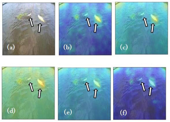 Inference was performed on each of the constructed models using the test dataset, and the resulting anomaly heatmaps are presented in Figure 3. Compared to the anomaly heatmap of Org, Org+AT and Org+NF exhibited regions with higher anomaly scores at the fish locations, while relatively high anomaly scores were observed in the non-fish water surface areas (Figure 3c,d). For Org+SinGAN, the colors indicating the anomaly scores at the fish locations were not as prominent, and relatively high anomaly scores were observed in the water surface areas, excluding the fish (Figure 3e). Furthermore, Org+SinGAN_pass showed that the anomaly scores were suppressed at the fish locations and the water surface areas, excluding the fish (Figure 3f).