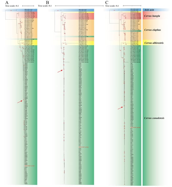 In total, thirty-nine complete mitogenomes covering seven subspecies of C. canadensis, four subspecies of C. elaphus, two subspecies of C. hanglu, and four individuals of C. albirostris downloaded from NCBI were used to investigate the phylogeny of the 89 C. canadensis individuals. Two sequences of Axis axis (JN632599 and OR143296) were used as an outgroup (Table 2). Phylogenetic analyses were performed using a maximum-likelihood method under three analytical schemes [35,36]: (1) CYTB, nucleotide alignment of gene CYTB; (2) PCGs_nt12, nucleotide alignment of concatenated 13 PCGs with the first two codon positions; (3) PCGs, nucleotide alignment of concatenated 13 PCGs. Phylogenetic trees were calculated using IQ-TREE v2.2.2.6 [37]. The best-fit model for each alignment was estimated using the ModelFinder algorithm [38] as implemented in IQ-TREE v2.2.2.6. Branch support was evaluated with ultrafast bootstrap approximation [39] for 1000 replicates. Resultant trees were visualized using Interactive Tree of Life (iTOL, https://itol.embl.de, accessed on 12 November 2024).