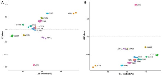 Skewness plots of 13 mitochondrial protein-coding genes of Cervus canadensis. (A) AT-skew plot. (B) GC-skew plot. Different colors represent different genes.