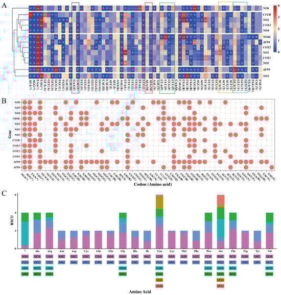 Codon usage statistics of the Cervus canadensis mitochondrial genome. (A) CUPs of 13 mitochondrial PCGs. Colors from blue to red represent RSCU values from small to large. “++” denotes RSCU value > 1.6, “−−” denotes RSCU value < 0.6 and “0” denotes RSCU value = 0. Colored rectangles highlight codon usage bias specific to gene ND6. (B) CAMs of 13 mitochondrial PCGs. Codons unused in each PCG are marked as red points. (C) Statistics of codon usage for synonymous codons of each amino acid and stop codon (*) in combination of 13 mitochondrial PCGs. Different colors denote different codons.