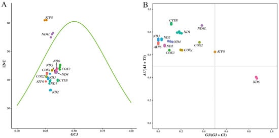 In order to further evaluate whether the mutation pressure and natural selection have influenced the codon usage bias, an ENC plot was drawn using ENC values against GC3s [21,22,35,57,58,59]. When the ENC value of a gene falls near the standard curve in the ENC plot, mutation pressure was thought to be the only factor affecting its third-position bases of codons. If the ENC value falls far below the standard curve, the codon bias of that gene was affected by natural selection [22,51,53,57]. In our ENC plot (Figure 5A), most genes clustered below the standard curve, suggesting that natural selection was the primary factor affecting their codon usage bias. The points of the gene ND4L were positioned near the standard curve, suggesting its codon usage bias was mainly influenced by mutation pressure. These results collectively demonstrate that the codon usage bias of mitochondrial PCGs in C. c. kansuensis populations is affected more by natural selection than mutation.