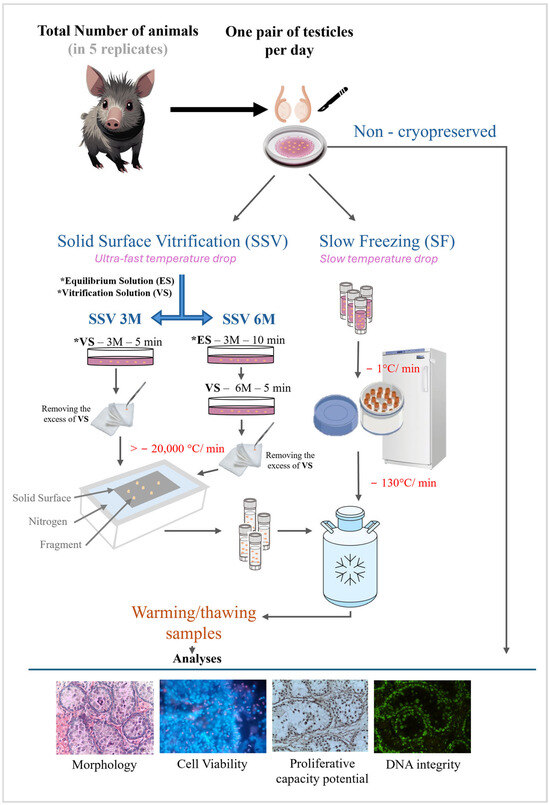 - Silva, A.M.; Bezerra, L.G.P.; Praxedes, E.C.G.; Moreira, S.S.J.; Souza, C.M.P.; Oliveira, M.F.; Pereira, A.F.; Comizzoli, P.; Silva, A.R. Combination of Intracellular Cryoprotectants Preserves the Structure and the Cells Proliferative Capacity Potential of Adult Collared Peccary Testicular Tissue Subjected to Solid Surface Vitrification. Cryobiology 2019, 91, 53–60. [Google Scholar] [CrossRef]