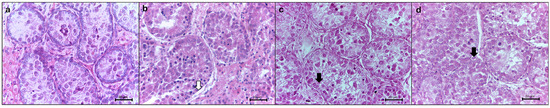 The testicular tissue was fixed overnight in a 4% paraformaldehyde solution, embedded in paraffin, and sectioned into 5-µm-thick slices. Sections were then mounted on Starfrost® slides (Knittel Glass, Braunschweig, Germany) and assessed using the In-Situ Cell Death Detection Kit (Roche, Basel, Switzerland), following the manufacturer’s protocol. Tissue sections were washed twice for 10 min in xylene and then gradually rehydrated through a series of ethanol dilutions (from 100% to 70%). Tissue sections were subsequently rinsed twice for 5 min in 0.05% Triton X-100 in PBS, permeabilized with 0.5% Triton X-100 in PBS for 30 min, and rinsed again for 5 min in 0.05% Triton X-100 in PBS.
