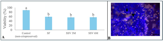 Percentages (means ± SEM) of viable cells in testicular tissue from prepubertal collared peccaries exposed to slow freezing (SF) and solid surface vitrification using 3 M (SSV 3 M) or 6 M (SSV 6 M) cryoprotectants (A). Representative micrograph of the evaluation of cell viability, in which the arrow shows the damaged cell (red fluorescence—probe: propidium iodide) and the arrowhead shows the intact cell (blue fluorescence—probe: Hoechst 33342) (B). Lowercase letters (“a, b”) above bars indicate significant differences among treatments according to Tukey test (p < 0.05). Scale bar: 20 µm.