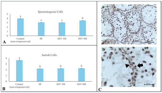 Proliferative capacity potential evaluated by quantification of nucleolar organizer regions (NORs) in testicular tissue from prepubertal collared peccaries after slow freezing (SF) or solid surface vitrification using 3 M (SSV 3 M) or 6 M (SSV 6 M) cryoprotectants. (A) Spermatogonia; (B) Sertoli cells; (C) NORs in testicular cells (black arrow and arrowhead). (a) Seminiferous tubule, scale bar 100 µm; (b) magnified seminiferous tubule area showing Sertoli cell (black head arrow) and spermatogonia (black arrow), scale bar 20 µm. Lowercase letters (“a, b, c”) above bars indicate significant differences among treatments according to Mann–Whitney test (p < 0.05).
