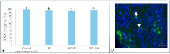 Percentages (means ± SEM) of cells with intact DNA in testicular tissue from prepubertal collared peccaries exposed to slow freezing (SF) and solid surface vitrification using 3 M (SSV 3 M) or 6 M (SSV 6 M) cryoprotectants (A). The arrow shows the damaged cell (green fluorescence) and the arrowhead shows the intact cell (B). Lowercase letters (“a, b”) above bars indicate significant differences among treatments according to Tukey test (p < 0.05). Scale bar: 20 µm.