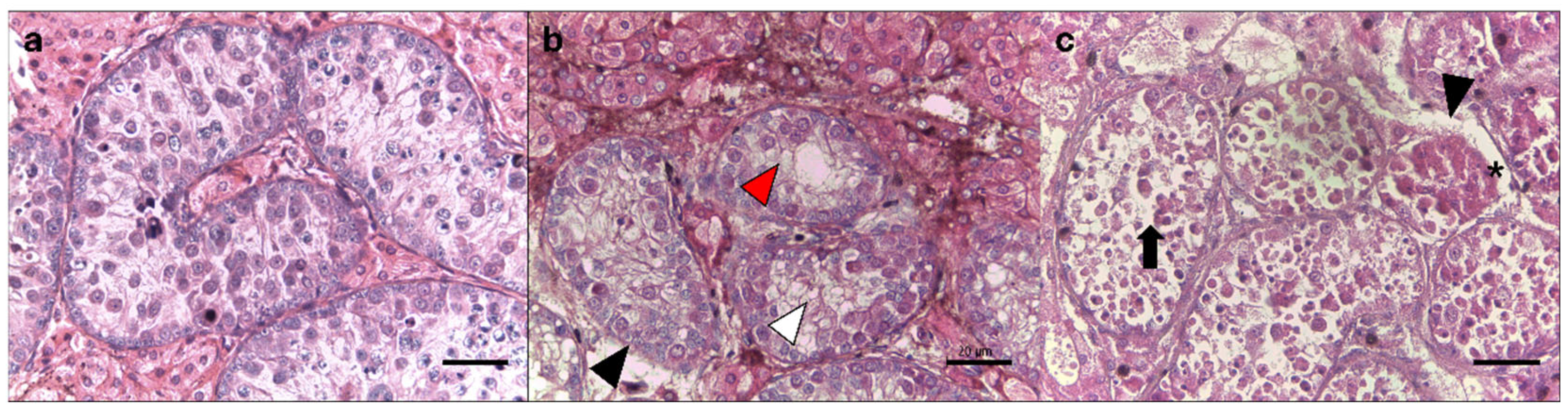 Morphological parameters of seminiferous tubules in testes from collared peccaries. (a) Normal tissue morphology (score 3 for all parameters). (b) Partly ruptured from basal membrane (score 2—black head arrow), >50% cells without swelling (score 2; red head arrow), >50% cells without swelling (score 3; white head arrow). (c) Loss of tubular morphology (score 1), mostly ruptured from the basal membrane (score 1; black head arrow), with all cell types present, albeit with a slightly disordered structure and loss of tubular morphology (score 2—black arrow) and shrinkage from the basal membrane (score 2—asterisk). Scale bar, 20 µm.
