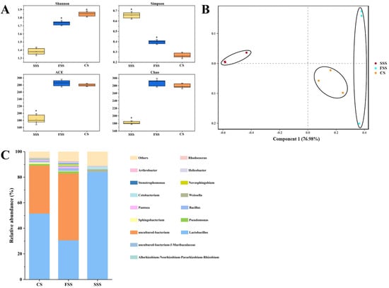 Bacterial community diversities of silage. (A) Alpha diversity of bacterial community. (B) Principal coordinates analysis plots with unweighted Unifrac dissimilarity of bacterial community. (C) Relative abundance of bacterial community at genus level in silage.* Means were significantly different in comparison with the CON group (* p < 0.05). SSS, sugar sweet sorghum silage; FSS, forage sweet sorghum silage; CS, corn silage.