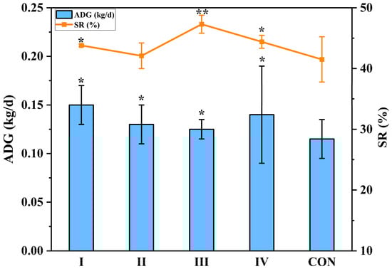 Goat performance of different groups. Error bars represent the mean standard deviation. * Means were significantly different in comparison with the CON group (* p < 0.05; ** p < 0.01). I, 50% FSS; II, 70% FSS; III, 50% SSS; IV, 70% SSS; CON, 50% CS; (FSS, forage sweet sorghum silage; SSS, sugar sweet sorghum silage; CS, corn silage).