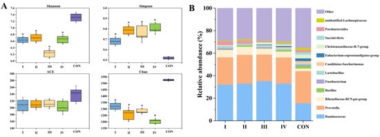 Bacterial community diversities of silage. (A) Alpha diversity of bacterial community. (B) Relative abundance of bacterial community at genus level in rumen of Boer goats. * Means were significantly different in comparison with the CON group (* p < 0.05). I, 50% FSS; II, 70% FSS; III, 50% SSS; IV, 70% SSS; CON, 50% CS; (FSS, forage sweet sorghum silage; SSS, sugar sweet sorghum silage; CS, corn silage).