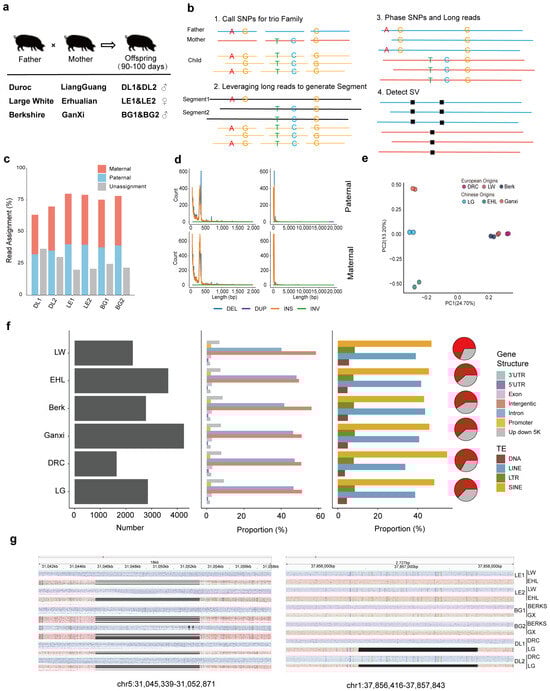 The effects of parentally inherited genetic variants on offspring phenotypes have long been a research focus. Accurate phasing of genetic variants is crucial for resolving their parental origins. While short-read whole-genome sequencing (WGS) in trio-based family designs allows partial phasing of SNPs, the accuracy of SV identification using short-reads sequencing is limited for variants exceeding read length. Recent advances in long-read sequencing have facilitated the phasing of phase-specific SVs in humans, primarily through computational haplotype block construction [60,61]. However, these studies often lack family-based phasing information. In contrast, family pedigree data are more accessible in animal studies, as demonstrated in cattle, where structural variants have been phased based on hybrid offspring with distinct parental origins [62]. Therefore, we integrated the high sequencing depth of second-generation sequencing with the long-range phasing capability of third-generation sequencing, while incorporating pedigree information to trace the origin of genetic variations in European–Chinese hybrid pigs. This approach provides a deeper understanding of how phased genetic variations influence gene expression and epigenetic modifications, offering valuable genomic resources for germplasm integration and breeding programs.