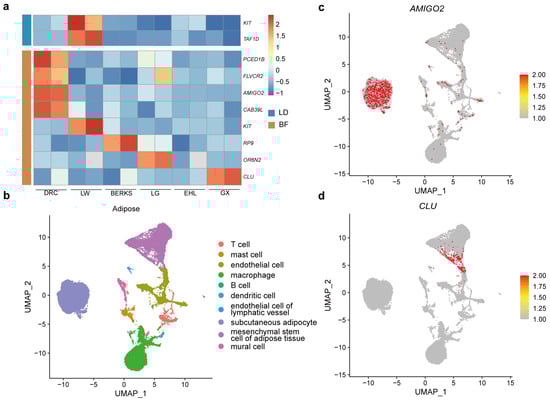 Lineage-specific gene expression and functional annotation. (a) Lineage-specific gene expression was found to be significantly associated with lineage-specific genetic variants. (b) UMAP plot depicting cellular composition of adipose based on scRNA-seq data. (c) Major cell type expression of AMIGO2 in adipose cells. (d) Major cell type expression of CLU in adipose cells.