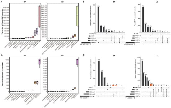 Distribution of genetic variants in different chromatin active regions and colocalization between phased genetic variants and phased histone modification and CTCF signals. (a) Distribution of SNPs in different chromatin states. (b) Distribution of SVs in different chromatin states. (c) Colocalization of phased SNPs with one or more phased histone modifications and CTCF signals (BF, left; LD, right). (d) Colocalization of phased SVs with one or more phased histone modifications and CTCF signals (BF, left; LD, right; Orange bars show the active chromatic indicator).