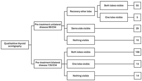 Of the 234 hyperthyroid cats, 135/234 (57.7%) cats had bilateral thyroid gland disease (i.e., two “hot” thyroid nodules), while 99/234 (42.3%) cats had unilateral thyroid gland disease (i.e., one “hot” thyroid nodule) and 5/234 (2.1%) cats had ectopic thyroid gland disease. Among the ectopic cases, four cats had ectopic thyroid tissue in combination with unilateral right-sided disease, and one cat had ectopic thyroid tissue in combination with bilateral disease (Table S1).