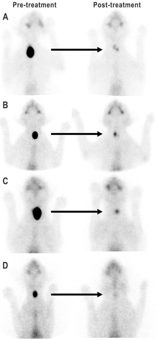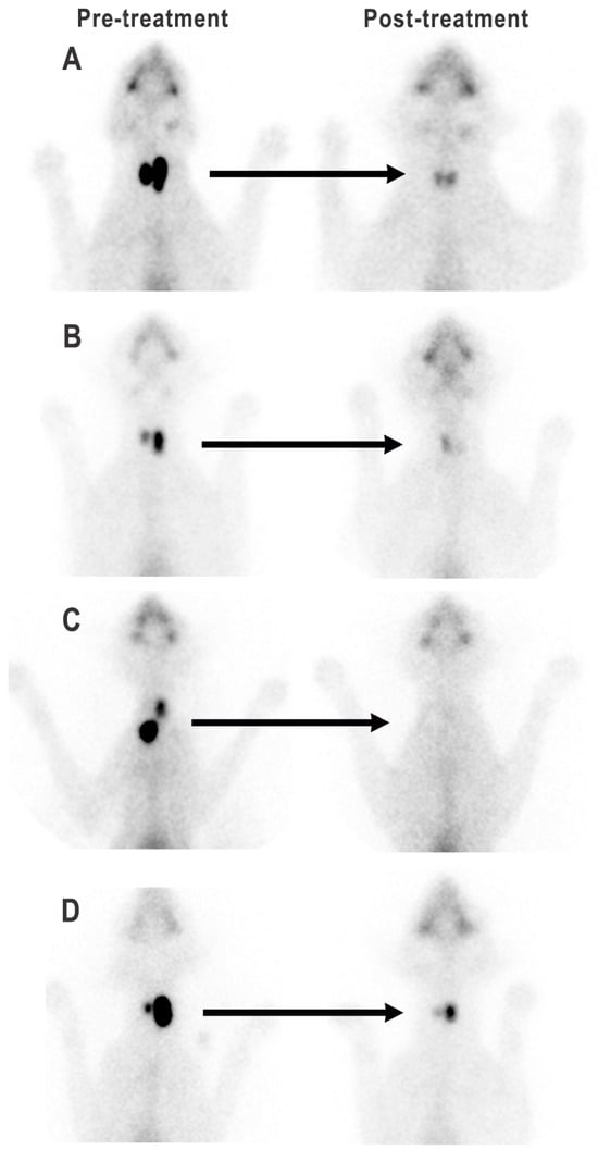 Thyroid scintigraphy in four cats with bilateral thyroid nodules, before and after treatment with 131I. (A) Reduction in size and radionuclide uptake of both “hot” thyroid nodules; (B) Complete ablation of the left thyroid nodule, with preservation of right thyroid lobe; (C) Near complete ablation of both thyroid nodules; (D) Reduction in size and radionuclide uptake of both thyroid nodules, with a persistent left-sided “hot” nodule.