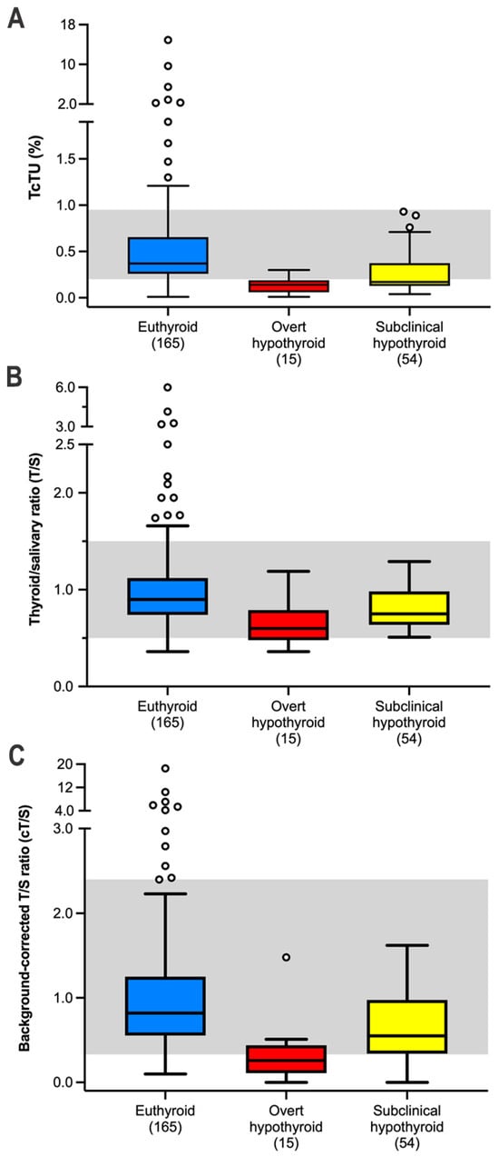 Box plots of follow-up quantitative scintigraphic results in 234 cats, divided into the 165 euthyroid cats and 69 with overt and subclinical hypothyroidism. (A) TcTU; (B) T/S ratio; and (C) background-corrected T/S ratio. Boxes represent the interquartile range from the 25th to 75th percentile. The horizontal bar in each box represents the median value. The T-bars represent the main body of data, which in most instances is equal to the range. Outlying data points are represented by open (white) circles. The shaded areas represent the reference intervals.