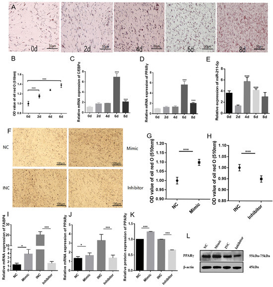 miR-211-5p promotes the differentiation of rabbit preadipocytes. (A) Oil Red O staining of lipid droplets at 0, 2, 4, 6, and 8 days post-differentiation. (B) Dissolve the Oil Red O staining agent with 100% isopropanol, and measure the OD value at 510 nm (n = 7). (C,D) mRNA expression levels of PPARγ and C/EBPα during the differentiation of rabbit preadipocytes (n = 6). (E) Relative expression levels of miR-211-5p during preadipocyte differentiation (n = 9). (F–H) Oil Red O staining of lipid droplets and measure the OD value at 510 nm (n = 7). (I,J) mRNA expression levels of PPARγ and FABP4 during the differentiation of rabbit preadipocytes transfected with NC, miR-211-5p mimic, INC, and miR-211-5p inhibitor (n = 8). (K,L) Determination of the gray value of protein expression level of PPARγ during the differentiation of preadipocytes in rabbits (n = 3). Data are presented as mean ± SD. * p < 0.05; *** p < 0.001.