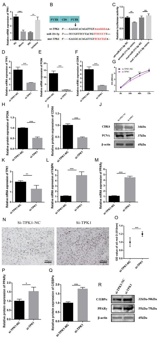 Effects of TPK1 on the proliferation and differentiation of rabbit preadipocytes. (A) mRNA expression levels of TPK1 in preadipocytes transfected with miR-211-5p mimic, NC, miR-211-5p inhibitor, and INC (n = 3). (B) Construct wild-type and mutant plasmids based on the binding sites between the TPK1 gene and miR-211-5p. (C) Luciferase assay performed by co-transfecting 293T cells with miR-211-5p mimic or NC and either wild-type or mutant TPK1 plasmids. (D) Interference efficiency of TPK1 during the proliferation process. (E,F) mRNA expression levels of CDK4 and PCNA during the proliferation of preadipocytes transfected with si-TPK1 and si-TPK1-NC (n = 9). (G) CCK-8 cell viability assay showing the absorbance of preadipocytes at 0, 24, 48, and 72 h post-transfection with si-TPK1 and si-TPK1-NC (n = 7). (H–J) Protein levels of CDK4 and PCNA during the proliferation of preadipocytes transfected with si-TPK1 and si-TPK1-NC (n = 3). (K) Interference efficiency of TPK1 during the differentiation process. (L,M) mRNA expression levels of FABP4, PPARγ during the proliferation of preadipocytes transfected with si-TPK1 and si-TPK1-NC (n = 3). (N) Oil Red O staining of lipid droplets. (O) Dissolve the Oil Red O staining agent with 100% isopropanol, and measure the OD value at 510 nm (n = 8). (P–R) Determination of protein levels and gray values of PPARγ and C/EBPα during the proliferation process of preadipocytes transfected with si-TPK1 and si-TPK1-NC (n = 3). Data are presented as mean ± SD. * p < 0.05; ** p < 0.01, *** p < 0.001.