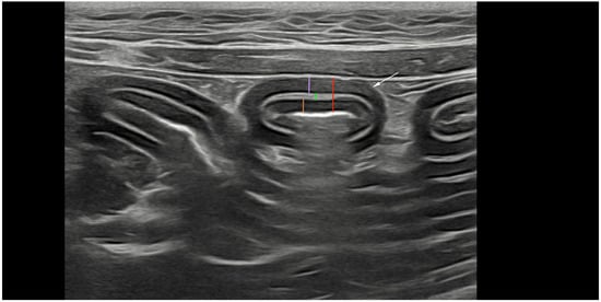 All abdominal ultrasonographic examinations were performed with the patient in dorsal recumbency. Representative ultrasonographic images were obtained using an 8–12 MHz linear transducer or curvilinear 5–8 MHz transducer (ATL 5000; Philips, Zofingen, Switzerland). All cats were fasted for a minimum of 8 h and bowel loops were free of gas. Three images of each bowel segment (duodenum, jejunum, and ileum) were obtained in transverse and sagittal planes, as described by Daniaux et al. [12]. At least three images were obtained of the largest mesenteric lymph nodes in the sagittal plane, and echogenicity and echotexture were recorded. We ultimately decided to only use the transverse plane for the ultrasonographic measurements of the intestinal wall and layer thickness based on the reported limitations of the longitudinal plane. Oblique measurements of the bowel cause errors of either the overestimation or underestimation of wall thickness [19]. Three full-thickness measurements of the duodenal and jejunal walls from the mucosa to the serosa of one wall, as well as measurements of the thickness of each layer (mucosa, submucosa, and muscularis) were performed (Figure 1). The maximal and minimal thicknesses of the ileal submucosa were measured in order to account for natural invaginations. Mesenteric lymph nodes were evaluated for maximal thickness, which was defined as the measurement perpendicular to the long axis of the largest lymph node. For all anatomical locations, the mean value of three measurements was used. The same ultrasonographic examinations were repeated after 12 and 24 weeks of standardized treatment, and the same measurements recorded at baseline were obtained after 12 and 24 weeks.