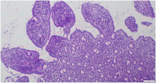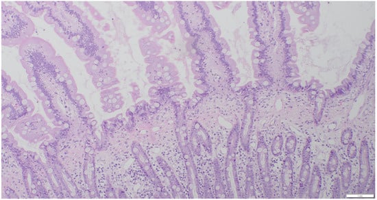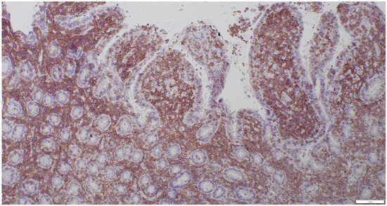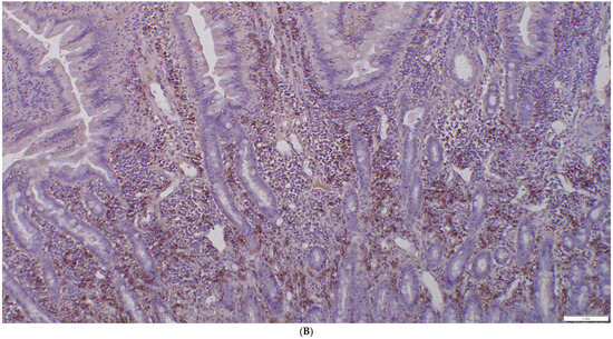 All cats underwent an exploratory celiotomy with full-thickness biopsies of the stomach, duodenum, jejunum, ileum, and liver, and biopsy of the largest mesenteric lymph nodes. Biopsies were divided for routine histopathology and immunohistochemistry tests, as well as clonality testing. One half was placed in buffered formalin 10% for histopathology; the other half was snap-frozen at −80 °C for later clonality testing. All histopathologic examinations were performed by two experienced board-certified pathologists according to the WSAVA histopathologic scoring system and a consensus diagnosis was made after discussing the cases [20,21]. A diagnosis of LPE was made when mixed lymphoid and plasmacytic inflammatory infiltrates and occasional neutrophils were present (Figure 2).