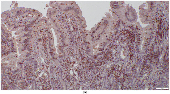 All cats underwent an exploratory celiotomy with full-thickness biopsies of the stomach, duodenum, jejunum, ileum, and liver, and biopsy of the largest mesenteric lymph nodes. Biopsies were divided for routine histopathology and immunohistochemistry tests, as well as clonality testing. One half was placed in buffered formalin 10% for histopathology; the other half was snap-frozen at −80 °C for later clonality testing. All histopathologic examinations were performed by two experienced board-certified pathologists according to the WSAVA histopathologic scoring system and a consensus diagnosis was made after discussing the cases [20,21]. A diagnosis of LPE was made when mixed lymphoid and plasmacytic inflammatory infiltrates and occasional neutrophils were present (Figure 2).