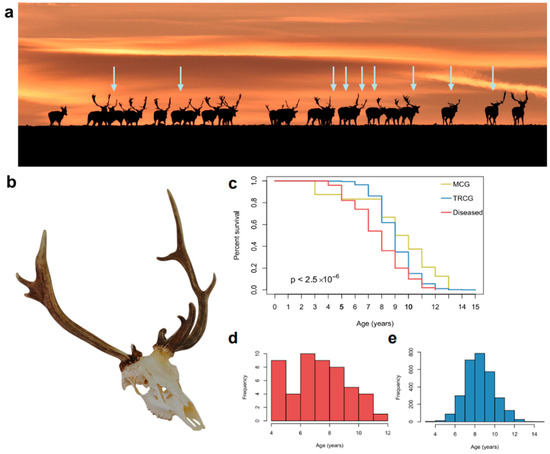 Antler abnormality in Southern Hungary. (a) A herd of fallow deer (Dama dama, DD) at sunset in the Kocsola region (Southern Hungary). Notably, 9 out of 23 individuals (39%) exhibit visible antler abnormalities (arrows) (Photo: Sándor Juhos). (b) Individuals with antler anomalies, like those shown in the photograph, are excluded from trophy evaluations, making it difficult to obtain reliable data on their prevalence. (c) Although hunting-related mortality is influenced by planned culling, it is still associated with the animal’s health status. Kaplan-Meier survival analysis revealed reduced life expectancy for animals with deformed antlers compared with healthy members of Morphological (MCG, n = 50) and Trophy Register (TRCG, n = 2912) Control Group (Kaplan-Meier curves contrasted with log-rank test). (d) The average age of the healthy (not showing antler abnormality) individuals to be evaluated is 9 years. (e) Compared to an average age of 7.74 years for aberrant DD trophies (p < 0.0001).