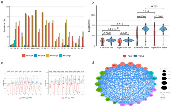 The presence of morphological anomalies (R, A, P, and S) was recorded with a value of 1 for presence and 0 for absence, separately for each side. A2.1 and A3.1 were considered as present if the brow tine and main beam length were lower than the bottom 20% and 5% quantiles of the distributions of brow tine and main beam length in the TRCG of the corresponding age and side. Pairwise comparisons between means, unless stated otherwise, were carried out using two-sample Wilcoxon tests, with Holm’s multiple testing correction. Computations were performed using the R language and environment version 4.4.3 [23], figures were drawn using ggplot2 [24], ggpubr [25], ggraph [26], and pheatmap [27].