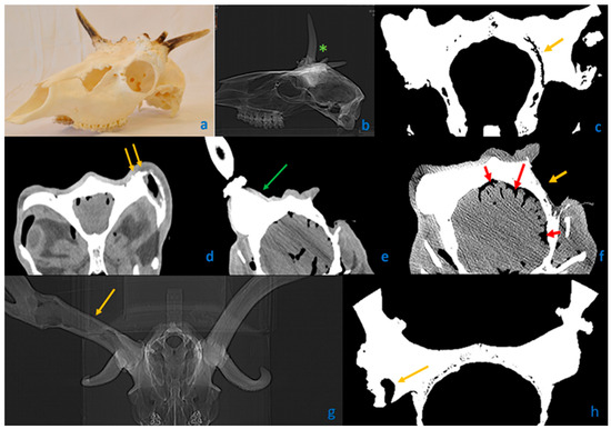 Computed tomography (CT) scans of three fallow deer (Dama dama) cases. (a–c) A trophy with severe involvement on both sides with aberrant antler beams (AAB). (d,e) Complete head with soft tissues. (g,h) The only case with cavity formation in an antler. (a) Bilateral loss of antlers with deformed pedicles and AAB. (b) Typically, no cavities are formed in AABs (marked with green asterisks). (c) Frontal scan through the antler pedicles. On the left side, not visible to the naked eye, a large gap-like cavity (yellow arrow) ran parallel to the cranial plane without displacement of the cranial bones. Development due to trauma is unlikely. (d) Whole head with soft tissues. Yellow arrows show the unevenness of the residual pedicle, suggestive of superficial chronic osteomyelitis. (e) The green arrow shows the deeper plane of the other side pedicle surface without significant radiographic abnormality. (f) In an even deeper plane, due to pus accumulation in the subcranial space, the widening of the sulci and thinning of the gyri (red arrows) suggest meningoencephalitis. The yellow arrow shows the lack of a pedicle. (g) Only one of our cases showed a cavity (yellow arrow) in the unilateral antler beam, which may indicate the death of the growth center cells during growth. (h) Necrotic cells may have exited through a fistula (yellow arrow) to the outside.