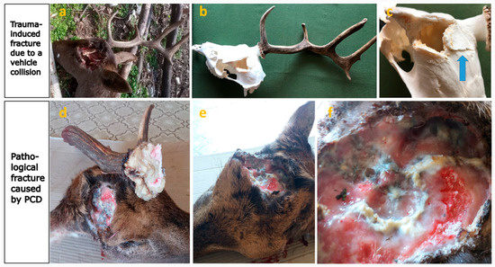 The difference between an obvious trauma-induced and a pathological fracture. (a) The top row of images shows the left antler broken out following a motor vehicle collision. (b) Condition after soft tissue removal. (c) The fracture surfaces were sharp and angular, with displacement of the cranial bone (arrow). (d) The bottom row shows the right antler and the site of the breakout, which occurred due to a fall following a hunter’s gunshot. Under normal circumstances, a fracture should not occur in this case. However, an underlying disease, secondarily infected with pyogenic bacteria, weakened the bone structure to such an extent that it fractured even under minimal force. The surface of the breakout, which covered a large area, was rounded. (e) Loss of the left antler occurred earlier. (f) Most of the fracture surfaces were covered with greyish-white pus, indicating a superinfection with pyogenic bacteria.