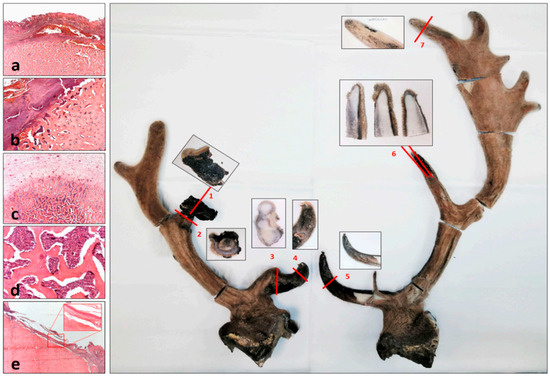 Microscopic examination of wounds caused by injury in the velvet phase, leading to antler deformity and asymmetry, suggests acute inflammation. The significant difference between the sides may be related to the different extent of the injuries and subsequent inflammation, and, therefore, a difference in the duration of the recovery period under which the antler could grow. The red numbers show the directions of the cut-offs for microscopic examination, and the adjacent images show the cut surfaces of the planes. (a) Subcutaneous hemorrhage and detachment from the bone surface are indications of injury (Cut 7). (b) The larger lesion was associated with necrosis of the skin and periosteum (upper left half of the figure). The superficially infiltrated blood layer confirmed that this was caused by trauma (Cut 2). (c) Inflammatory cells also reached the deep cancellous bone tissue (Cut 5). (d) The intertrabecular spaces of the cancellous bone were filled with acute inflammatory cells (neutrophil granulocytes) (Cut 5). (e) During re-epithelialization, the epithelium slides from the skin surface adjacent to the lesion to the free bone surface. The resulting contact is consistent with one of the histological components of the peduncular–dermal junction (PDJ) and is indicative of a longer period of regeneration. The inset shows a bony–epithelial contact area without the dermis. The gap is a retraction artifact formed during fixation (Cut 6).