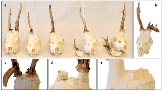 Pedunculitis Chronica Deformans (PCD) caused trophy anomalies on roe deer (Capreolus capreolus, CC). (a) Our five cases, ordered by severity, showed signs of PCD. (b) One velvet-phase injured CC with intact rose, pedicle, and skull; therefore, the deformity in the antlers is not due to PCD. (c) CC Case 1, as seen from behind. There are no brow tines or antler burrs on either side. (d) CC case 2 seen from behind. The distal pedicle surface showed pitting on both sides, more prominently on the side from which premature casting occurred. On this side, fissure formation between the pedicle and frontal bone and on the other side, the loss of burr granulation are evident. (e) On the left side of CC case 4, a margin crest developed on the broadening pedicle base, showing osteoblastic bone building activity.