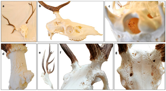 Signs of Pedunculitis Chronica Deformans (PCD) on red deer (Cervus elaphus, CE). (a–d) A two-year-old stag trophy with a broken-out right pedicle. The fracture happened during the hunt, therefore, we could examine both sides. (a) The fracture pattern serves as an example of juvenile PCD, where aseptic bone necrosis leads to pathological fracture. The right mean beam was shorter and less developed than the left. (b) The broad breaking surface involved most of the frontal bone and approached the orbital arch. (c) View through the foramen magnum towards the right pedicle base. The spongy perforations occurred without displacement of the skull bone surface and were not situated along a line of force, which could be a sign of a traumatic impact. (d) The broken-out pedicle showed remarkable pitting on the proximal two-thirds of its surface without deformation or loss of rose granulation. (e–g) A case of a five-year-old stag as an example where the inhibited cast wound healing could lead to an adult-type PCD. (e) The difference between the two sides was prominent, as only an aberrant antler beam developed on the right side. (There is no brow tine; therefore, we cannot consider it as an antler). (f) Total loss of rose granularity on both sides without pedicle shortening, broadening, or deformation, but surface irregularity is obvious. (g) The spongy bone remodeling due to osteoclast activation is a hallmark of PCD in CE. On both sides, more of the frontal bones were involved, and the disease was reaching the orbital arches too. In contrast to fallow deer (Dama dama), there is no bony crest formation and broadening of the pedicle, which could be a sign of elevated osteoblast activity.