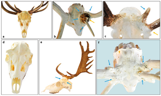Morphological changes in Pedunculitis Chronica Deformans (PCD) suggest disrupted osteogenesis of the pedicle and antlers by scar tissue. (a) Bilateral aberrant antler beams (AAB) can be considered derivatives of antler-forming buds that have retained their developmental capacity between the dissecting scar tissues. They correspond to the phenomenon described as spike-on-one-side (SOOS) but can also be bilateral. (b) The top view of a velvet phase trophy shows intramembranous ossification (blue arrows) around the left, but it is not casted AAB (yellow arrow). In this case, the AAB caused the lateralization of ossification originating from the antlerogenic stem cells (ASC) of the chondro-osseous tissue. This process increases the diameter of the pedicle and moves it laterally. (c) In cases of severe ASC loss, little residual antler tissue can form (blue arrow), typically on the periphery, often located on the orbital arch (yellow arrow). (d) Bilateral total pedicle loss leads to the “hummel” condition. (e) In the place of the left pedicle, only a widened bone ridge-like edge remained (blue arrows), which did not correspond to secondary healing after fracture. The widening of the right pedicle is suggestive of PCD, and the long brow tine and massive palm formation can be considered compensatory growth. (f) A bony trophy can only indirectly evidence scar formation. However, its appearance with small nodules (blue arrows) corresponds to scars dissecting the chondro-osseous tissue.