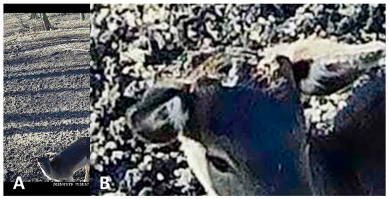 Trail camera footage from around the village of Szakcs (South Hungary, Middle Europe) from our study area. (A) This living “hummel” fallow deer (Dama dama) buck proves that the loss of antlers on both sides is survivable. (B) However, the survival time is questionable. The magnification shows a rather large loss of skull fragments on the left side.
