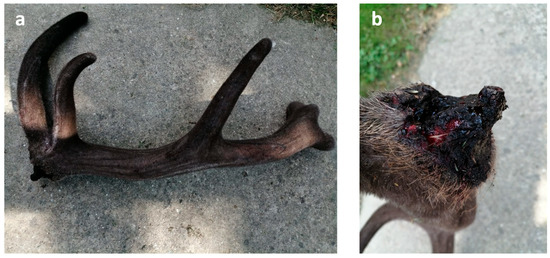 - Kierdorf, U.; Kierdorf, H.; Konjević, D. Pathological fracture of a red deer antler secondary to purulent inflammation—A case report. Vet. Arh. 2013, 83, 347–356. [Google Scholar]