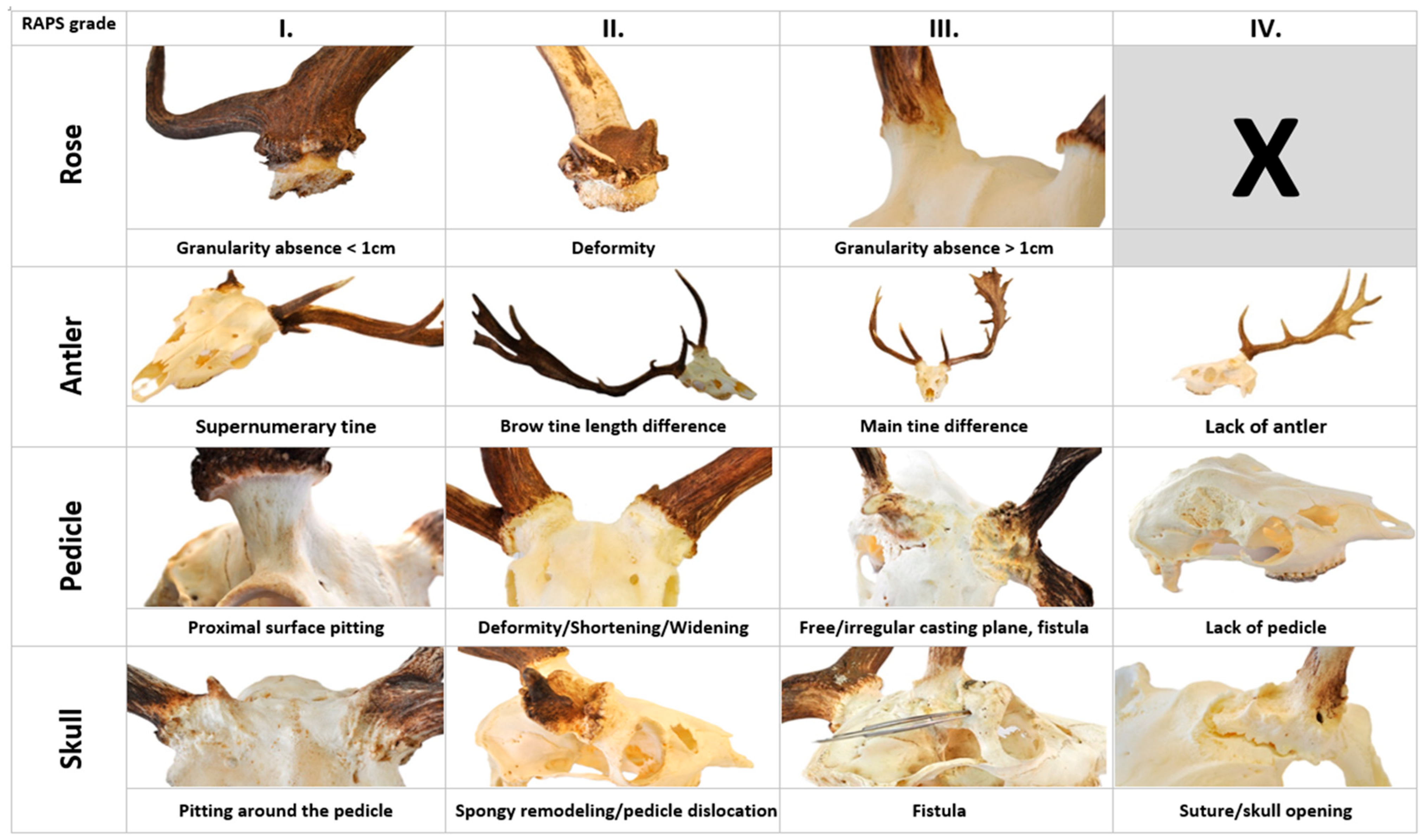 The assessment of the RAPS (rose/pedicle/antler/skull) features describes Pedunculitis Chronica Deformans (PCD) and its severity. The RAPS features can be grouped into three grades for the rose and four for the pedicle/antler/skull. Grade I: Lack of continuity in the grain of the rose is longer than 5 mm but less than 1 cm. (R1). A supernumerary tine originating from the rose can be a sign of an extra antler bud (A1). Pitting on the proximal surface of the pedicle (P1). The pitting extends to the skull surface (S1). Grade II: A deformity of the rose that is visible to the eye is a deviation from a regular circle. This is not independent of the pedicle deformity (P2) and visible on cast antlers, too (R2). The length difference between the two sides of the brow tines (A2) and the difference from the trophy register control group (A2.1), which is derived from data of the Hungarian trophy register after exclusion of cases marked abnormal (see text). The pedicle deformity characteristic of PCD in fallow deer (Dama dama) is a difference in the major and minor axis lengths of more than 4 mm, also visible by eye (P2). Shortening (P3) and widening (P4) of the pedicle beyond normal extent. Spongy remodeling of skull bones where the cavities are larger than at intertrabecular spaces in cancellous bone (S2) or visible in the center of the pedicle has shifted significantly, mostly towards the brow ridge (S6). Grade III: Loss of rose granularity is greater than 1 cm (R3). The difference in length of the main beams relative to each other (A3) and the difference relative to the Trophy Register Control group (A3.1). A pedicle fistula (P5, or a free casting plane without any protruding antler-bony structure (P6). A fistula mouth opens distant from the pedicle on the skull (S4). Grade IV: Absence of antlers or aberrant antler beams (A4). More than fifty percent of the casting plane of the pedicle is in or below the plane of the skull, which is considered to be the absence of it (P7). Discohesion along the interosseous suture (S3) or separation of cortical bone independently is a sign of bone displacement (S4).