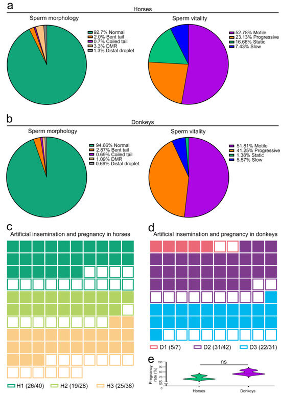 Evaluation of horse and donkey sperm quality and gestation. (a) CASA features of horse sperm. (b) CASA features of donkey sperm. (c) Pregnancy outcomes of artificial insemination in horses. Different colors correspond to different horses, with solid squares denoting horses that conceived after artificial insemination and hollow squares denoting horses that did not conceive. (d) Pregnancy outcomes of artificial insemination in donkeys. Different colors correspond to different donkeys, with solid squares denoting donkeys that conceived after artificial insemination, whereas hollow squares denote donkeys that did not conceive. (e) Pregnancy rates of horses and donkeys. The data are expressed as the means ± SDs. p < 0.05 indicates a statistically significant difference. “ns” represents not significant. H1: Horse1, H2: Horse2, H3: Horse3; D1: Donkey1, D2: Donkey2, D3: Donkey3.