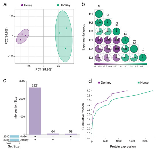 Seminal plasma proteome of horses and donkeys. (a) PCA of seminal plasma proteomes between horses and donkeys. (b) Correlation circle diagram of seminal plasma proteomes between horses and donkeys. (c) UpSet plot of seminal plasma between horses and donkeys. (d) CDC of seminal plasma proteomes between horses and donkeys.