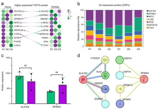 Presentation of seminal plasma CEPs in horses and donkeys. (a) The highly expressed TOP10 protein in the seminal plasma of horses and donkeys connects the same proteins on both sides in a straight line. Left: horse; right: donkey. (b) The relative abundance of 7 CEPs in the seminal plasma of horses and donkeys. (c) KLK1E2 and SPINK2 protein expression in the seminal plasma of horses and donkeys was determined via proteomic sequencing data. (d) PPIs of KLK1E2 and SPINK2 in Equus species. The data are expressed as the means ± SDs. “ns” represents not significant. H1: Horse1, H2: Horse2, H3: Horse3; D1: Donkey1, D2: Donkey2, D3: Donkey3.