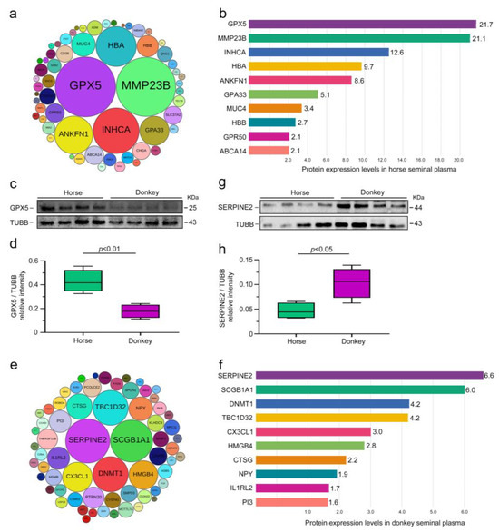 Classification of seminal plasma SEPs in horses and donkeys. (a) A total of 59 SEPs in horse seminal plasma, with the different-sized circles indicating the expression levels of proteins. (b) The expression levels of the top 10 SEPs in horse seminal plasma. (c) GPX5 protein expression in horse and donkey seminal plasma was determined by Western blotting. (d) Quantification of the relative intensity of GPX5/TUBB. (e) A total of 64 SEPs in donkey seminal plasma, with the different-sized circles indicating the expression levels of proteins. (f) Expression levels of the top 10 SEPs in donkey seminal plasma. (g) SERPINE2 protein expression in horse and donkey seminal plasma was determined by Western blotting. (h) Quantification of the relative intensity of SERPINE2/TUBB. TUBB protein expression was employed as an internal reference for normalization. p < 0.05 indicates a statistically significant difference.