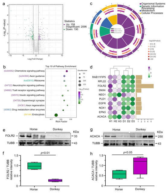 Comparison of seminal plasma DEPs in horses and donkeys. (a) Volcano plot of horse and donkey seminal plasma DEPs, with downregulated and upregulated proteins represented by green and purple dots, respectively. (b) Enrichment circle diagram displaying the primary classification of the top 10 KEGG signaling pathways in horse and donkey seminal plasma. (c) Bubble chart displaying the three-level classification of the top 10 KEGG signaling pathways in horse and donkey seminal plasma. (d) The expression of the top 10 DEPs in horse and donkey seminal plasma. (e) FOLR2 protein expression in horse and donkey seminal plasma was determined by Western blotting. (f) Quantification of the relative intensity of FOLR2/TUBB. (g) ACACA protein expression in horse and donkey seminal plasma was determined by Western blotting. (h) Quantification of the relative intensity of ACACA/TUBB. TUBB protein expression was employed as an internal reference for normalization. p < 0.05 indicates a statistically significant difference. H1: Horse1, H2: Horse2, H3: Horse3; D1: Donkey1, D2: Donkey2, D3: Donkey3.