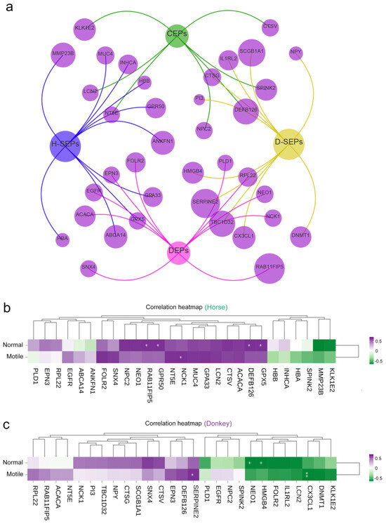 Correlation between horse and donkey seminal plasma protein and sperm quality. (a) The PPI network of horse and donkey seminal plasma CEPs, SEPs, and DEPs. H-SEPs: horse seminal plasma SEPs. D-SEPs: donkey seminal plasma SEPs. (b) The correlation between horse seminal plasma protein and normal sperm morphology and motility. (c) The correlation between donkey seminal plasma protein and normal sperm morphology and motility. The scale (0.5 to −0.5) in color indicates whether the correlation is positive (purple) or negative (green). A single asterisk (*) indicates a statistical difference (p < 0.05); a double asterisk (**) indicates a significant statistical difference (p < 0.01).