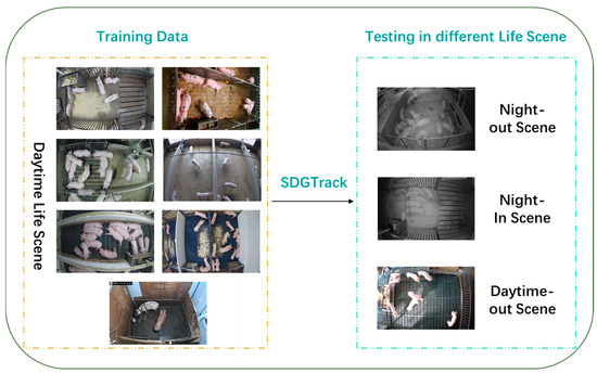 While existing research has made significant progress in tracking within specific scenarios, the performance of these models often drops sharply when applied to new or unknown environments due to their limited generalization capabilities. This is primarily because most models rely heavily on background information specific to the training scenarios, lacking adaptability to diverse environments. In pig farming, scene diversity manifests in various aspects, such as lighting conditions and scene changes [20]. These factors pose significant challenges for models handling cross-scene tasks, as changes in background information can drastically affect identification and tracking performance in different farming environments. To address the issue of poor model performance in unknown scenarios, we have innovatively proposed SDGTrack, which introduces adaptive modules and improves existing tracking strategies. This enables the model to distinguish and learn background information across different scenes. Experimental results show that SDGTrack not only performs well in known scenarios but also maintains high tracking accuracy in unknown environments.