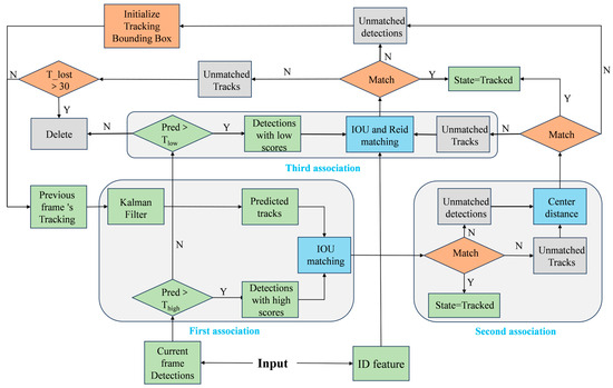 To improve the model’s generalization ability in dynamic scenarios, we optimized the matching strategy in the Multiple Object Tracking (MOT) algorithm. Traditional tracking methods often rely on high-confidence detection boxes. However, in changing or unknown environments, detection accuracy may vary significantly, resulting in poor target matching when accuracy is affected by scene changes. Inspired by ByteTrack, we proposed the Re-Byte method. By dividing detection boxes into high and low thresholds, we enrich the target matching information, reducing the negative impact of scene changes, lighting variations, and occlusions on subsequent tracking tasks. This enhances the model’s generalization across complex conditions. Figure 4 illustrates the improved Re-Byte tracking process, which integrates multiple factors for target matching, significantly enhancing the model’s adaptability and robustness in challenging environments.