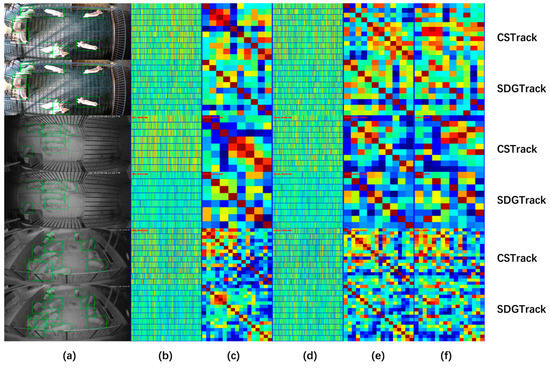 Visualizes of the discriminative capability of ID embeddings: (a) detection results; (b) visualization of ID embeddings for detected objects; (c) pairwise relationships between ID embeddings of detected objects in the current frame; (d) visualization of ID embeddings in the target sequence template; (e) pairwise relationships between ID embeddings in the target sequence template; (f) matching relationships between ID embeddings of detected objects in the current frame and those in the target sequence template.