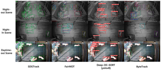 We compared the tracking performance of our model with two other representative tracking solutions, including a two-stage tracking method based on the YOLO model with different tracking strategies [36,37,38,39] and the fastest anchor-free FairMOT scheme. The results, shown in Figure 6, reveal that SDGTrack not only achieved the best tracking performance across all three scenarios but also recorded the fewest ID switches.