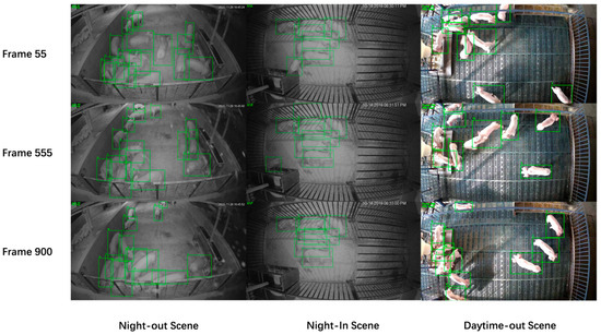 Beyond lighting conditions, background complexity and pig density also had a noticeable impact on model performance. In the Daytime-Out scenario, despite similar lighting to the training data, differences in pen layout and spatial structure made background modeling more difficult, leading to degraded detection accuracy and increased identity confusion. In the Night-Out scenario, where pig density was the highest, frequent occlusions occurred, compounded by complex background textures and variable lighting, resulting in more false detections and degraded identity matching.